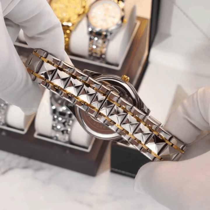 * Bracelet : Maille robuste en acier inoxydable bicolore (argent et or/jaune) avec un motif géométrique ou facetté sur les maillons centraux, prolongeant l'esthétique luxueuse du boîtier.